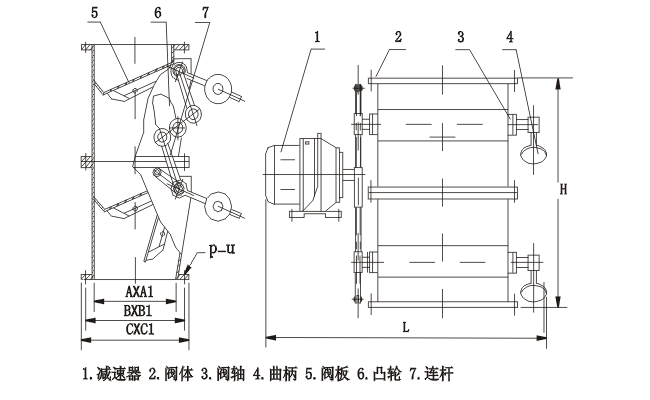 由減速器帶動傳動桿通過曲柄、凸輪及連桿分別帶動上、下兩傳動軸旋轉(zhuǎn),交互開啟,通過配備的杠桿系統(tǒng)或拉伸彈簧,保證閥板可靠的復(fù)位,防止野風(fēng)吹入,依確定的開閉頻率完成系統(tǒng)的給卸料。